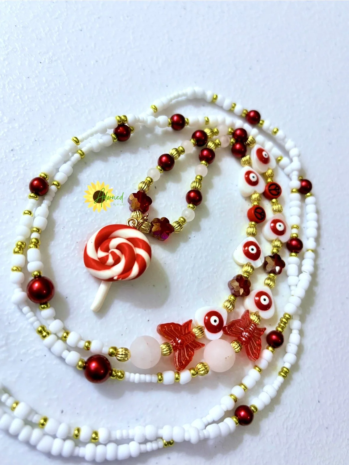 The lollipop symbolizes pleasure and inner-child delight reclaimed without guilt. Natural shell evil eye hearts add ancestral-style protection and emotional shielding. Light rose quartz and clear quartz beads soften the energy with love, harmony, and amplification — allowing desire and protection to coexist beautifully.