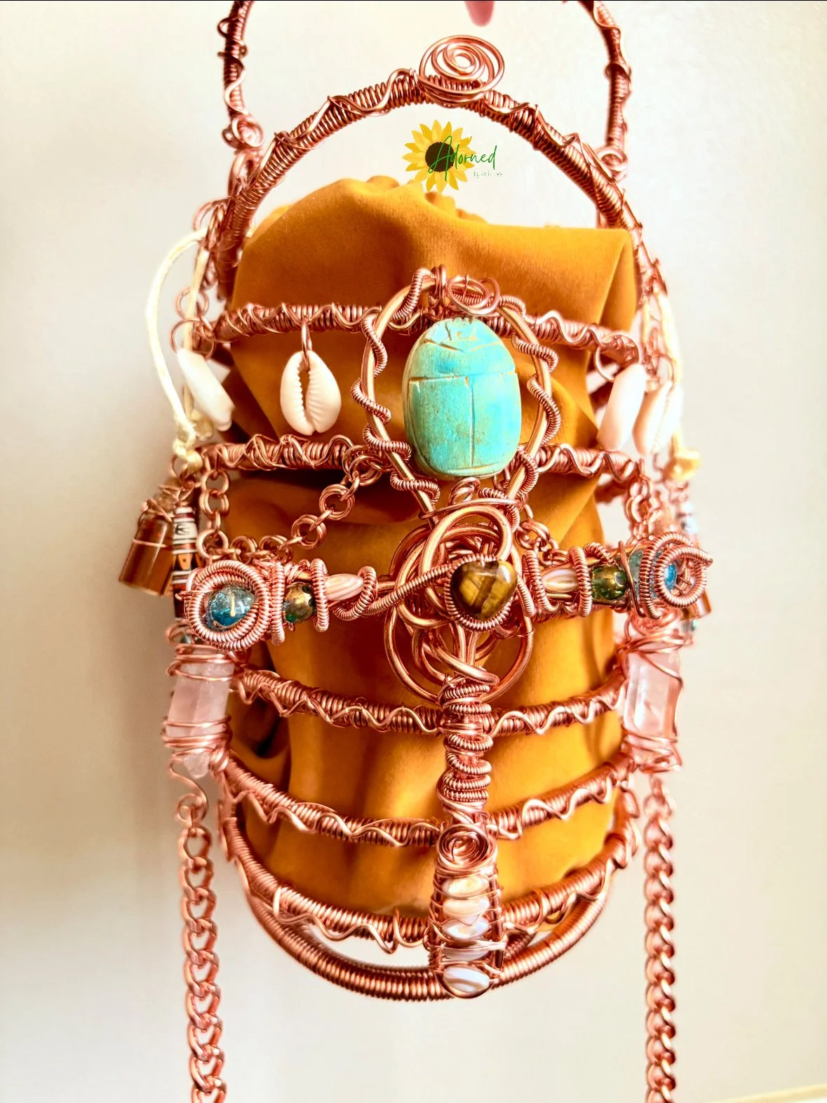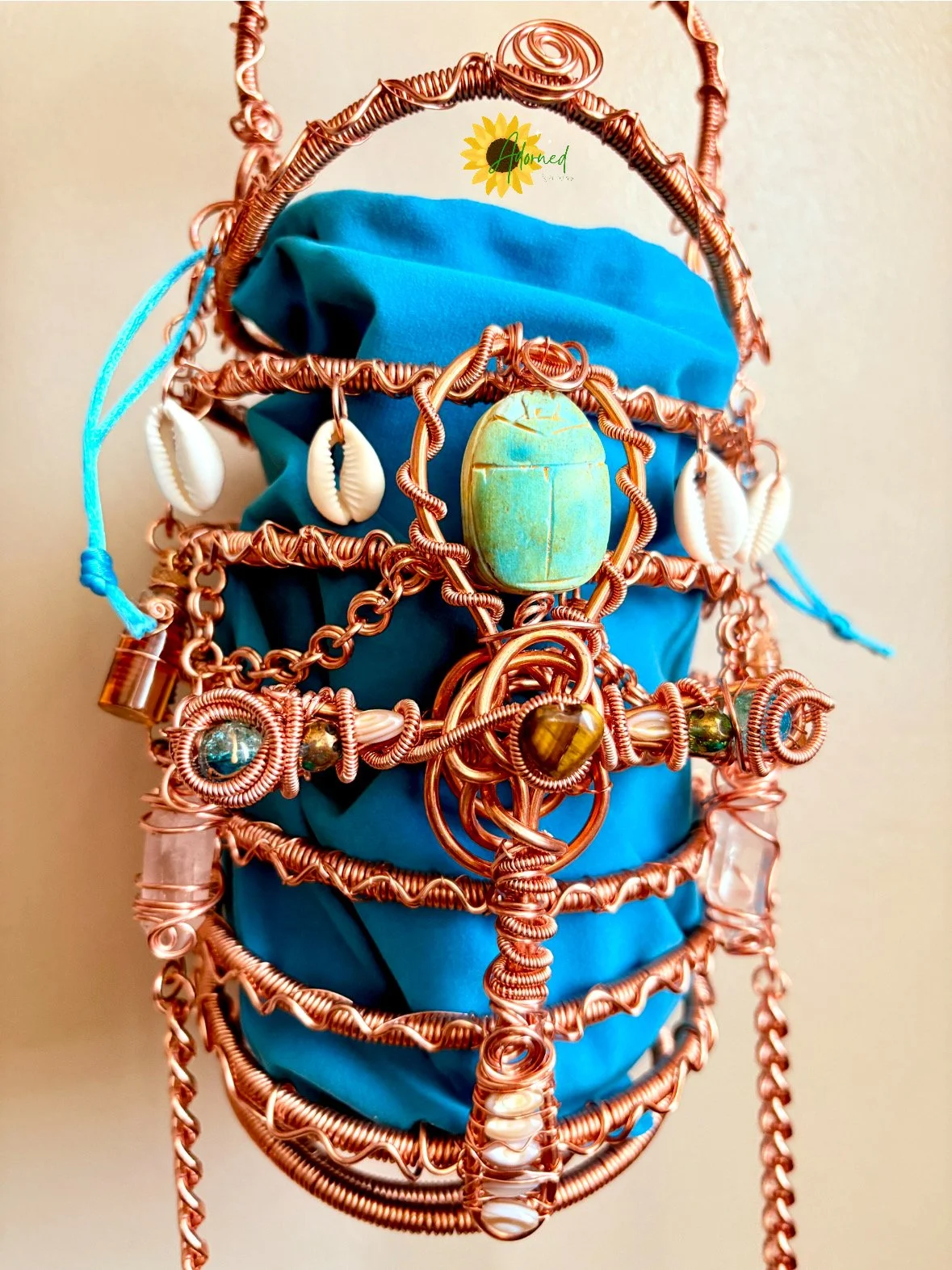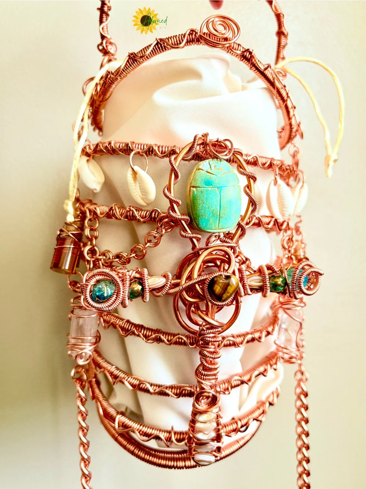 At the heart of the piece rests a scarab, symbolizing renewal, protection, and safe passage through cycles of transformation. Quartz accents amplify clarity and intention, while Tiger’s Eye brings courage, grounded confidence, and forward momentum. Mother of Pearl softens the structure with balance and intuitive flow, adding a gentle luminosity that contrasts beautifully with the strength of copper. A honey-filled vial introduces sweetness and magnetism—inviting abundance in a way that is natural, patient, and ease-filled rather than forced.