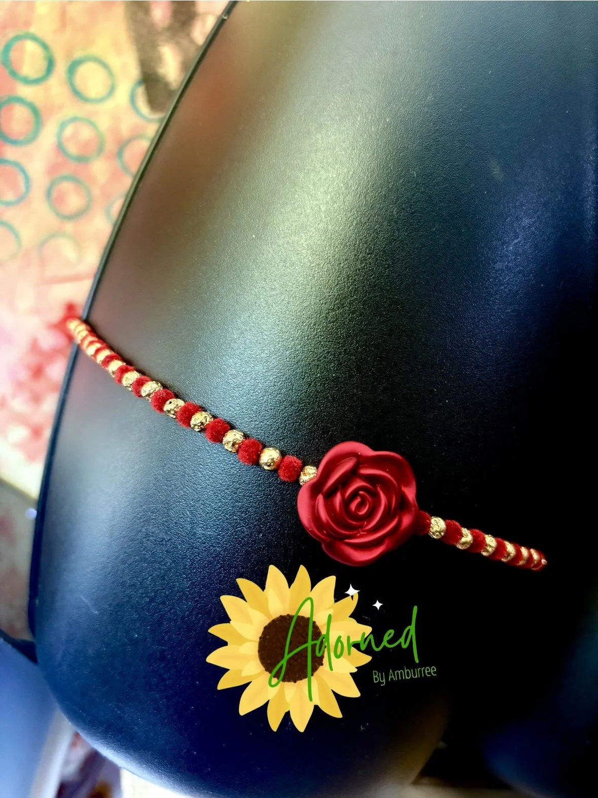 This stretchy slip-on thigh bead features a bold deep red rose focal centered between plush velvet red beads and metallic gold accents, creating a rich, romantic contrast against the skin. The texture mix gives this piece a soft yet luxe feel — sweet, confident, and unmistakably feminine.