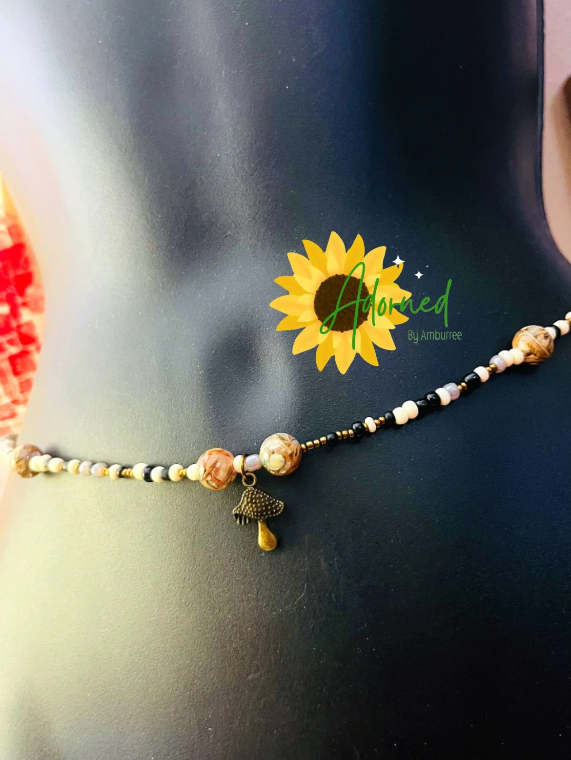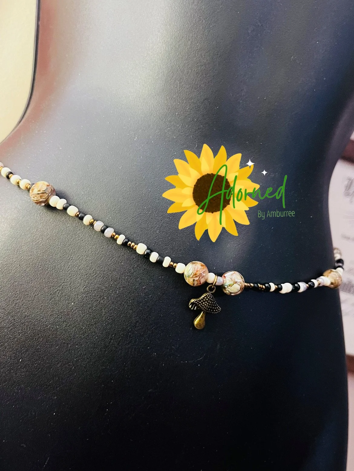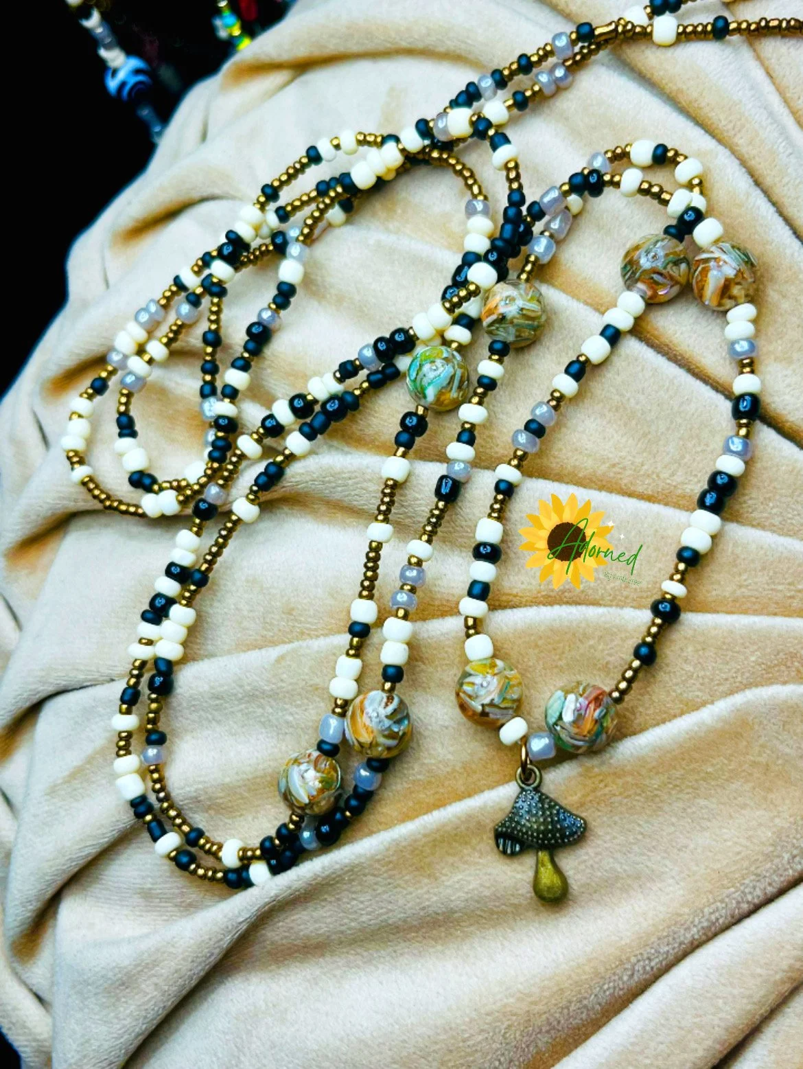 This 58” waist bead is a portal into transformation and earthy magic. Centered with a bronze mushroom charm, Mystic Shroom channels the energy of rebirth, grounding, and altered vision—reminding you that growth often comes from the unseen roots below.
