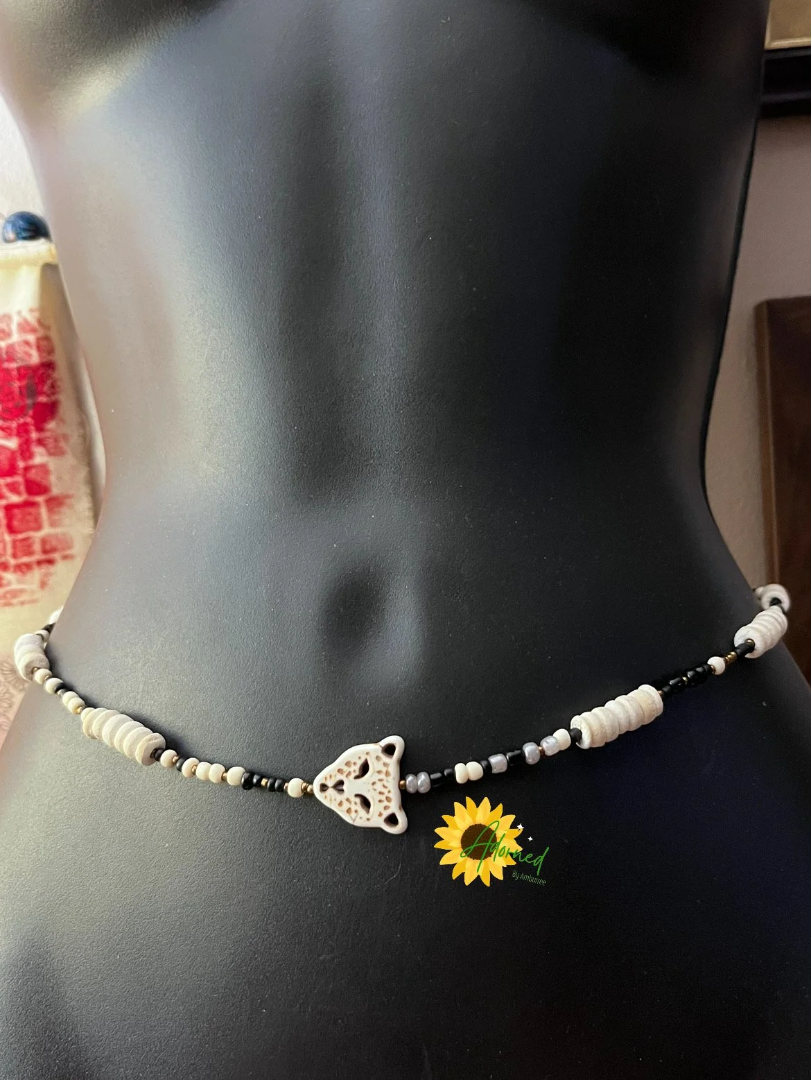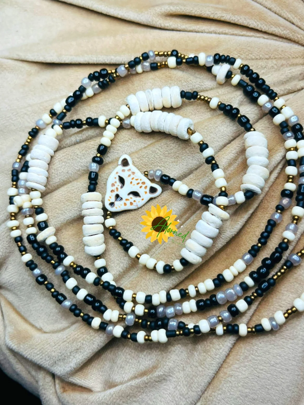 This 55” waist bead carries the regal essence of the leopard and the protective power of turquoise. At its center rests a carved turquoise leopard head charm, merging the fierce grace of the huntress with the healing wisdom of stone medicine.