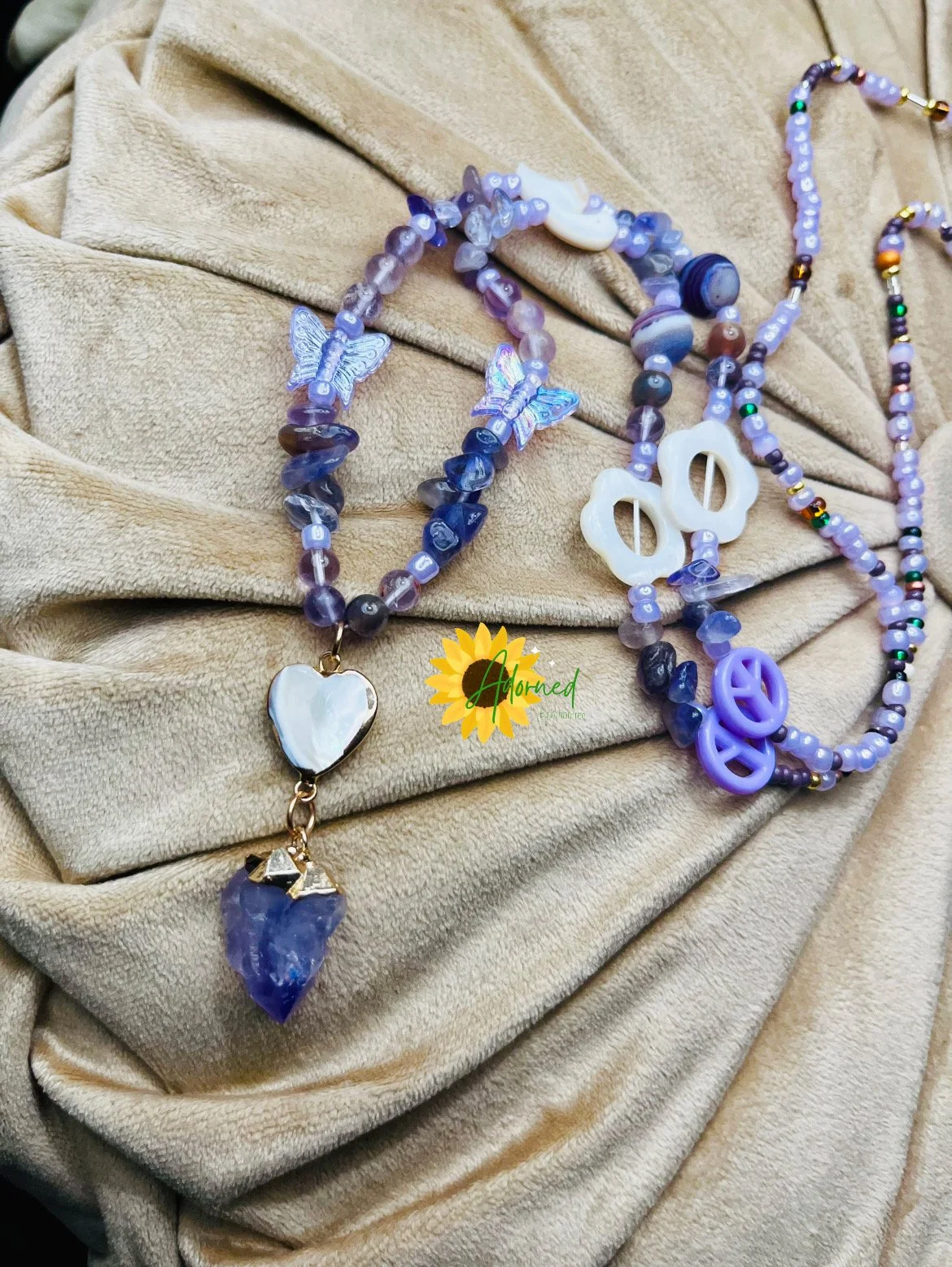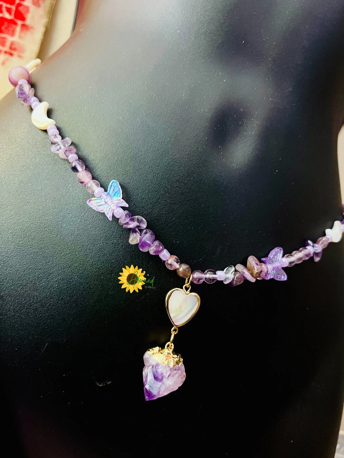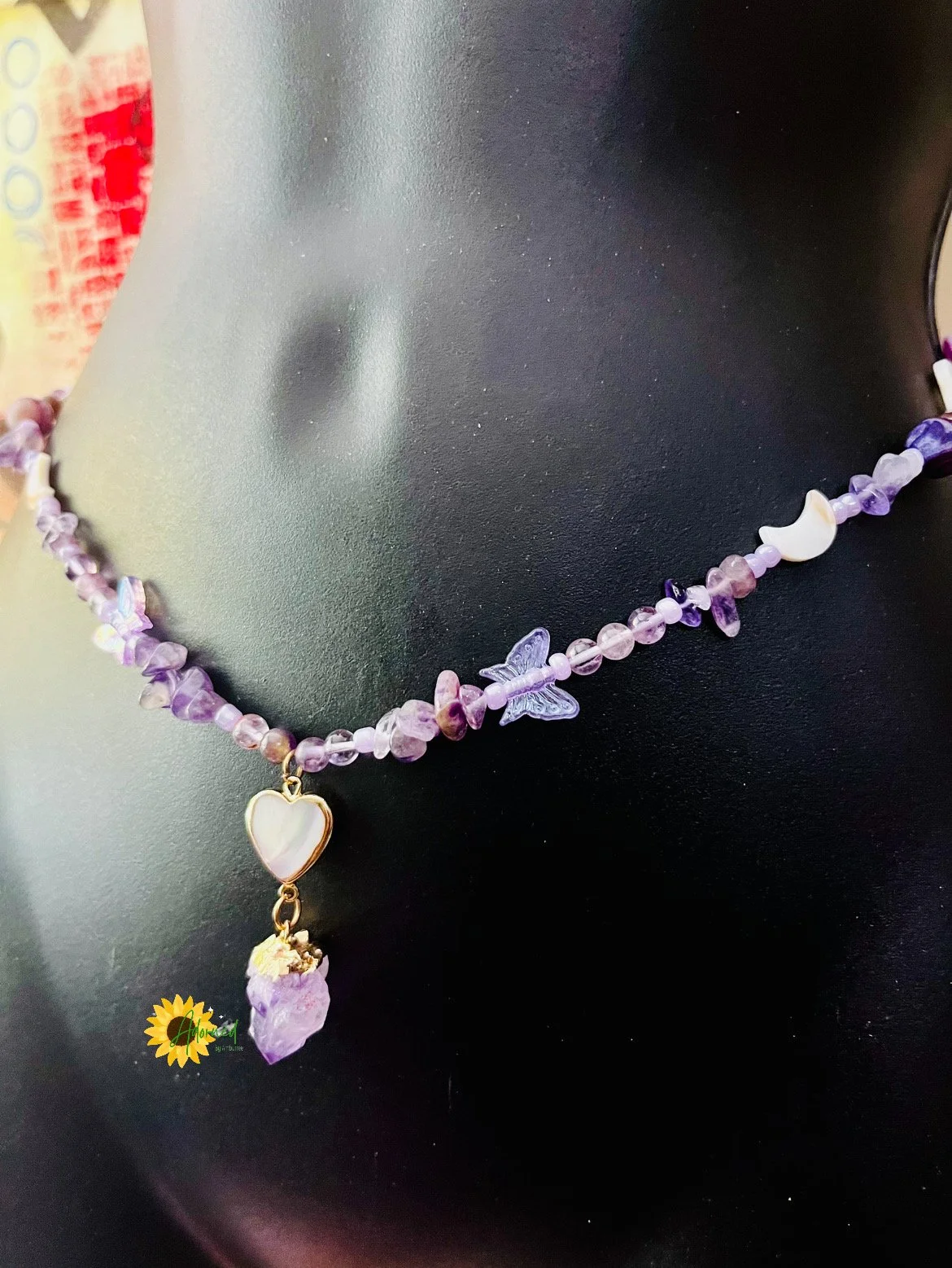 This 54” waist bead features polished amethyst chips, dreamy lavender accents, iridescent butterfly beads, and celestial moon charms. At its center hangs a mother-of-pearl heart, crowned with a raw amethyst heart drop wrapped in gold — radiating both elegance and spiritual power.