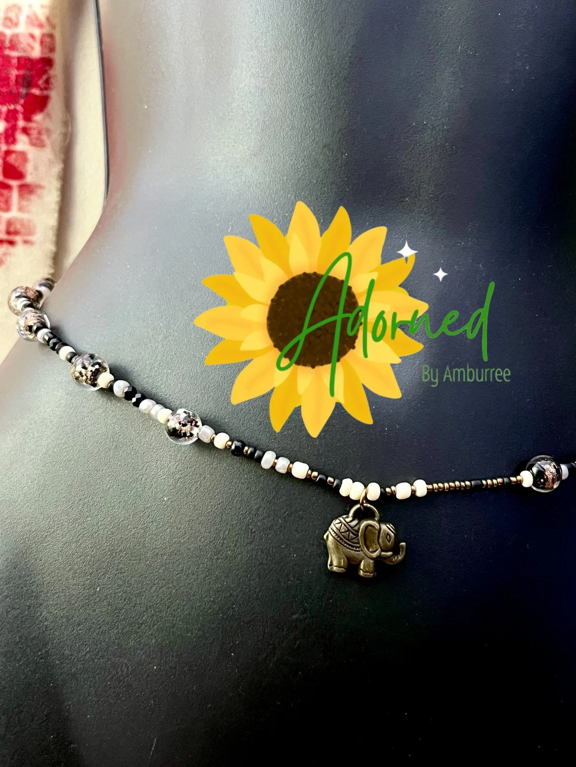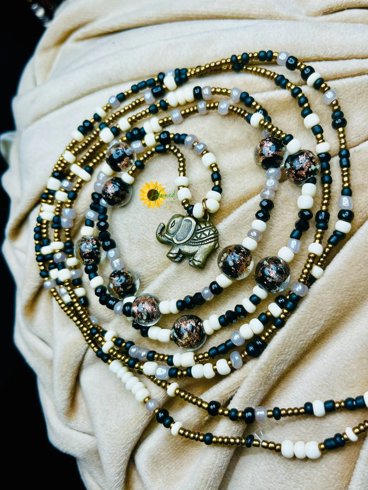 This 60” waist bead honors strength, protection, and ancestral memory. At its center rests a brass elephant charm—symbol of wisdom, good fortune, and spiritual guardianship.