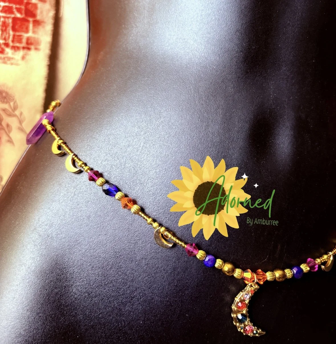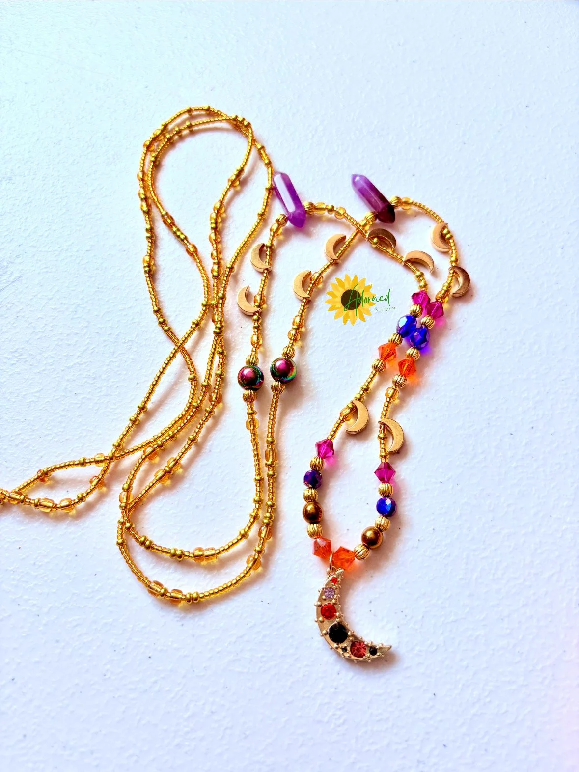 Moonspell Mirage is a celestial waist bead designed to balance intuition with grounded confidence. Warm gold seed beads create a luminous flow, accented by crescent moon charms that symbolize cycles, femininity, and renewal.