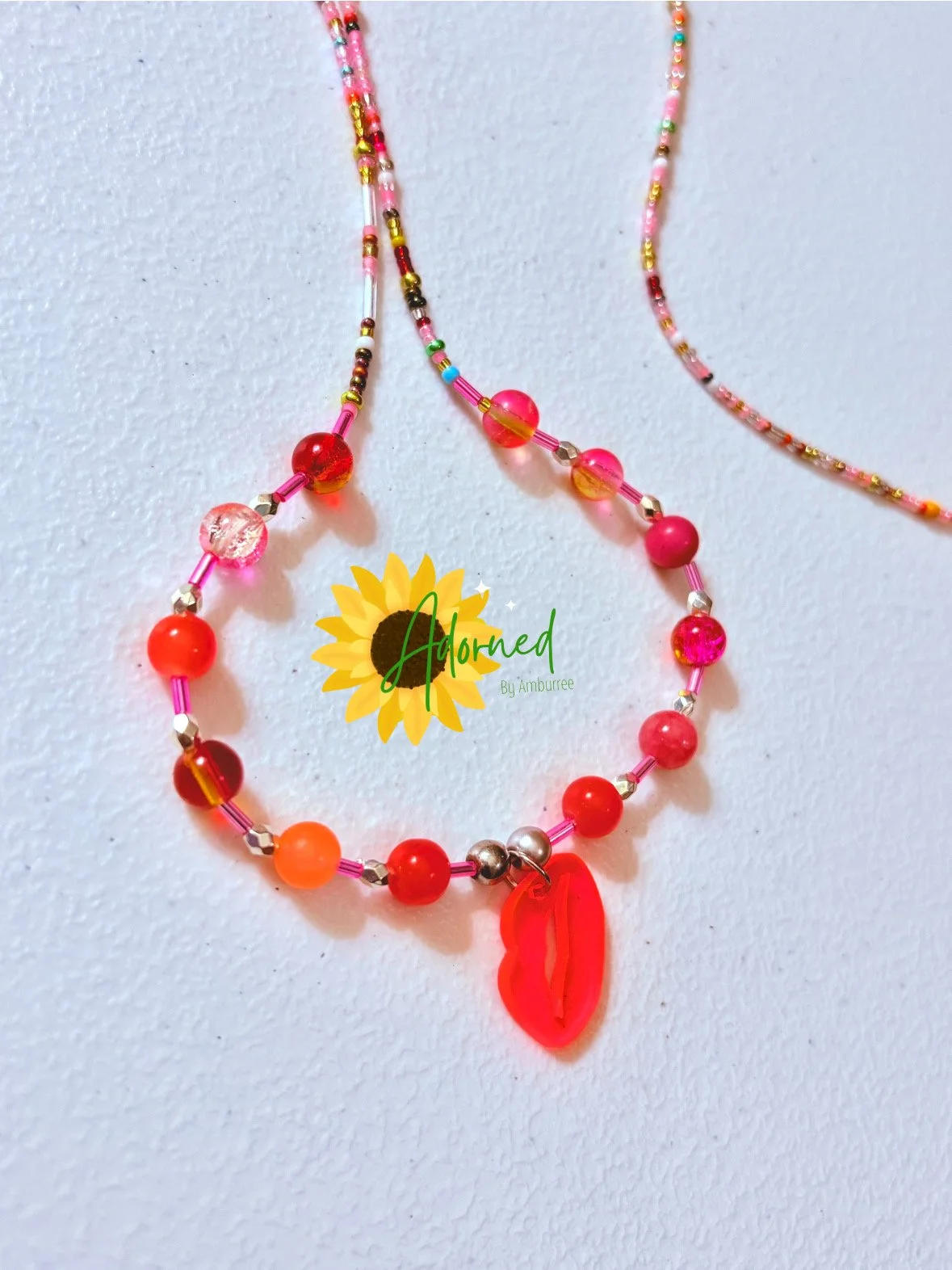 Warm reds, blush pinks, and translucent tones flow together effortlessly, giving this strand a flirty yet grounded energy. Gold accents add a subtle glow, while the lip symbol represents owning your voice, your desire, and your presence without shrinking or over-explaining.