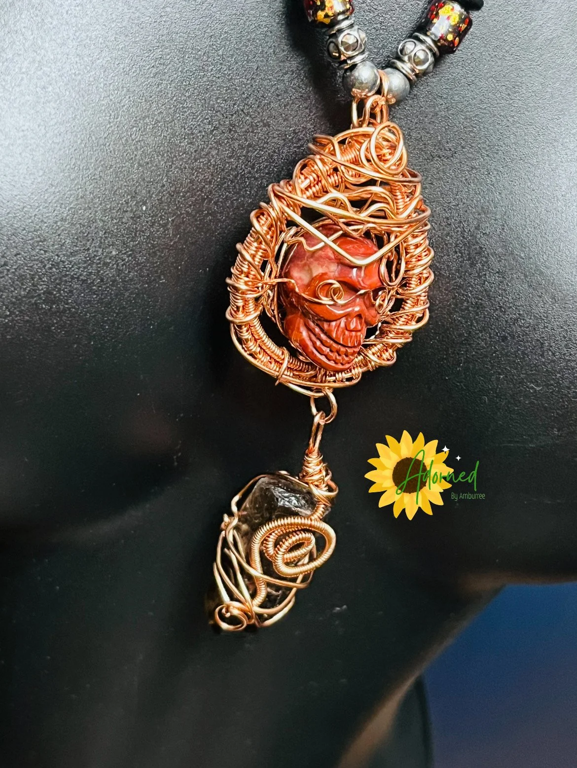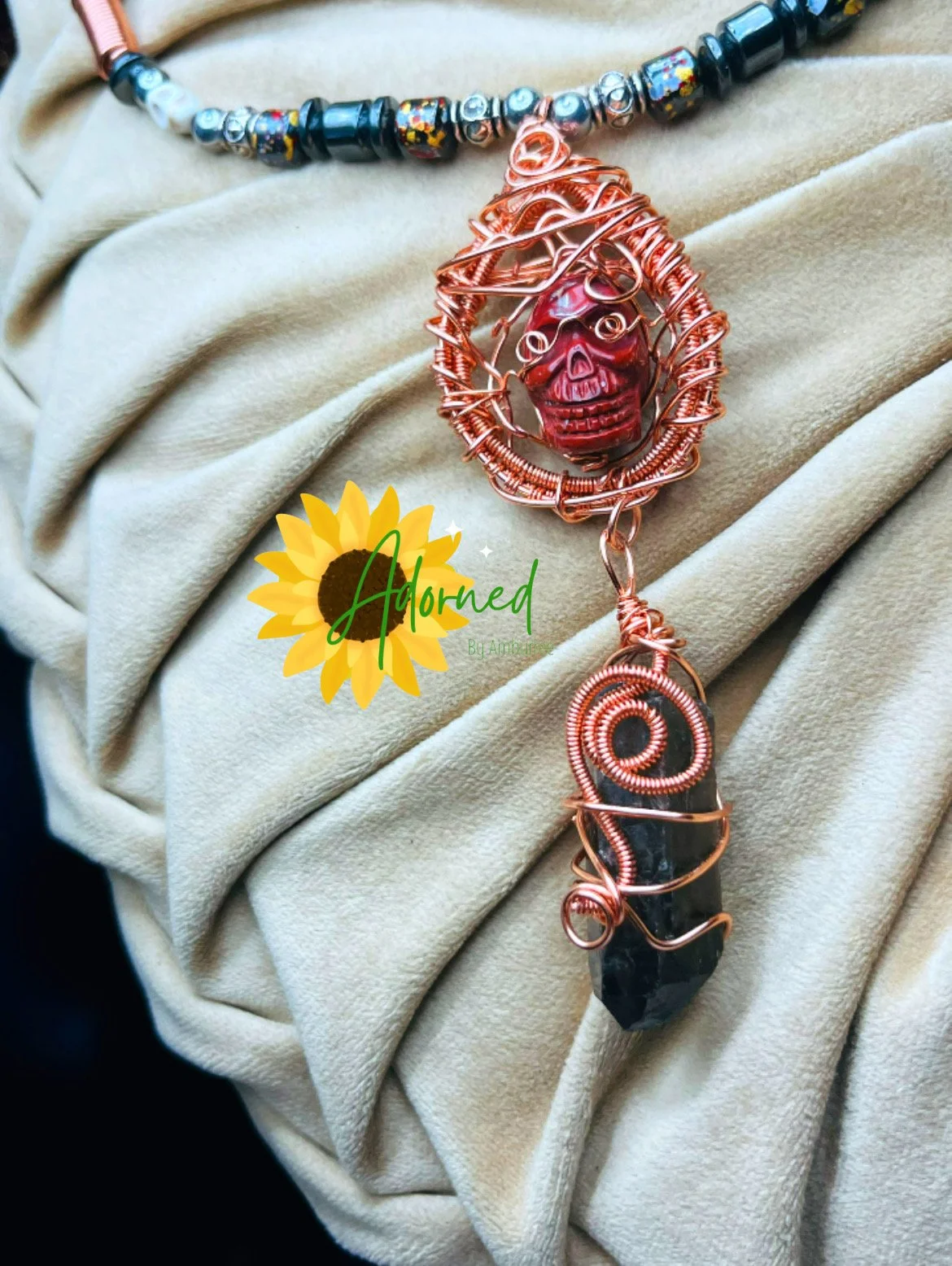 The copper-wrapped skull stands as both guardian and guide, bridging realms between seen and unseen. Suspended below, a smoky quartz point channels ancestral protection and shadow clarity—transmuting fear into wisdom.