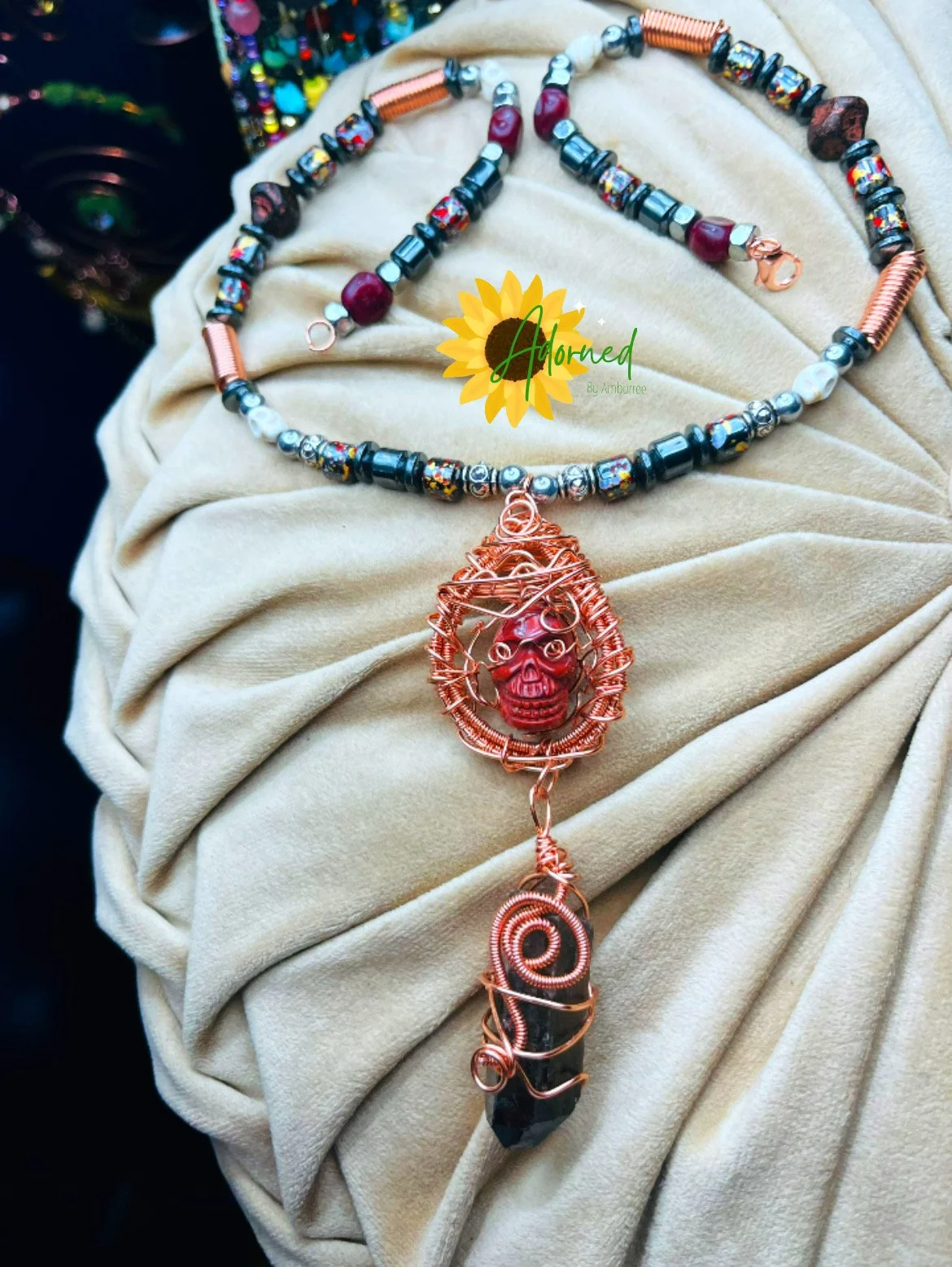 The beaded chain is a story of lineage: hematite beads hand-painted in red and gold to represent sacred power and inheritance, four coiled copper beads for eternal return, and four howlite skulls to honor the keepers of your bloodline. Silver accents mirror balance within legacy—reminding you that power is best carried in peace.