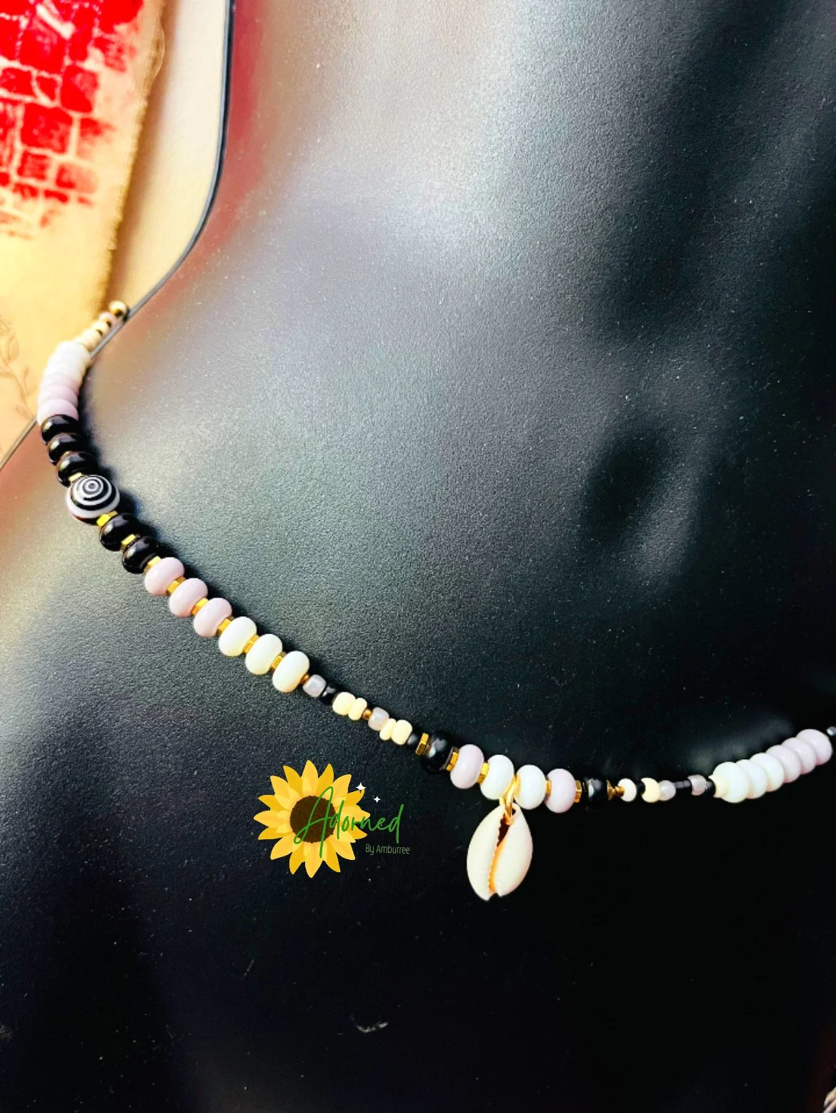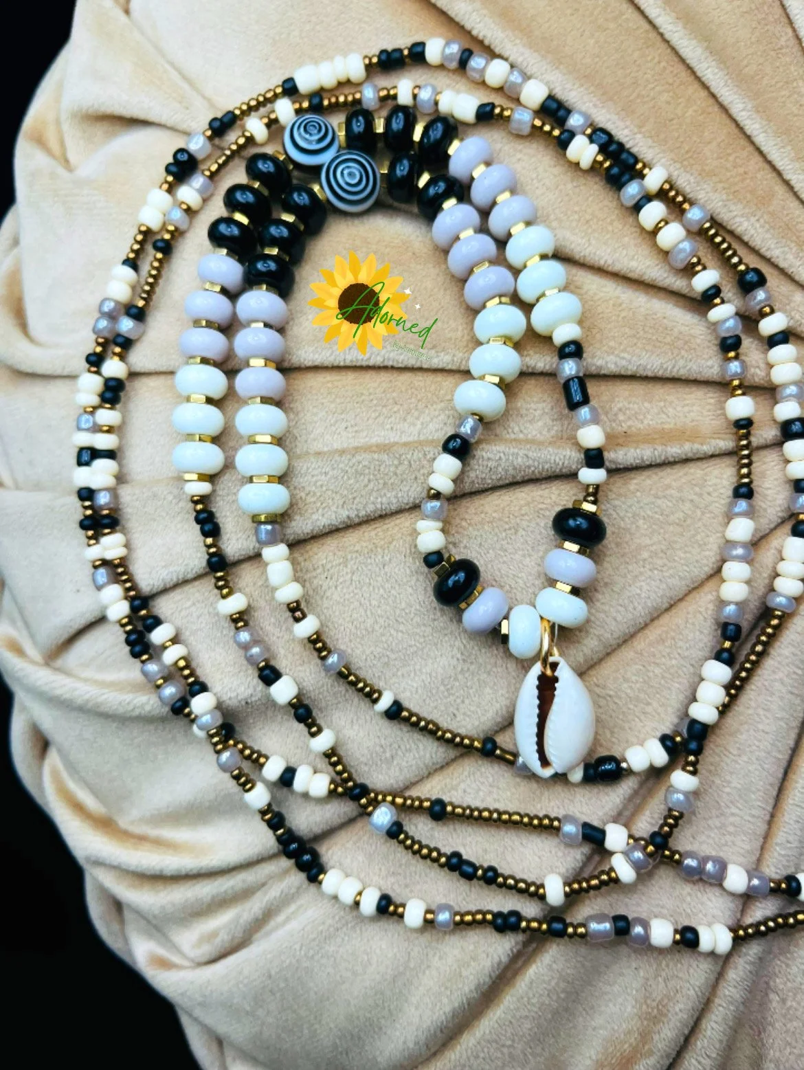 This 60” waist bead honors the sacred tides that carry ancestral wisdom through you. At its center rests a cowrie shell—a symbol of wealth, divine femininity, and spiritual connection—flowing like an offering from ocean to womb.