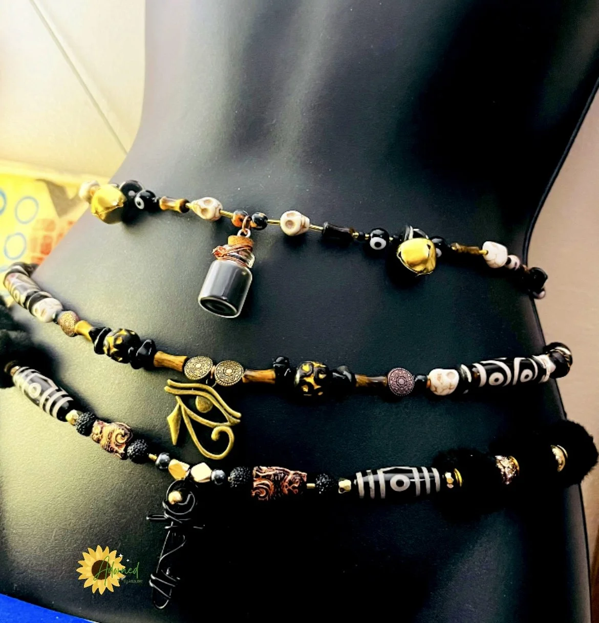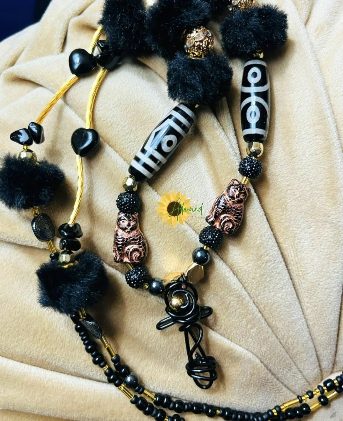 A sacred trio (sold separately )crafted to honor Bastet, Hoodoo tradition, and Ancient Egyptian power — this set is a wearable temple, merging feline guardianship, conjure symbolism, and protective gemstones into one luxurious collection. Each piece carries layered meaning, designed for those who walk with ancestors, spirit, and intuition at their side.