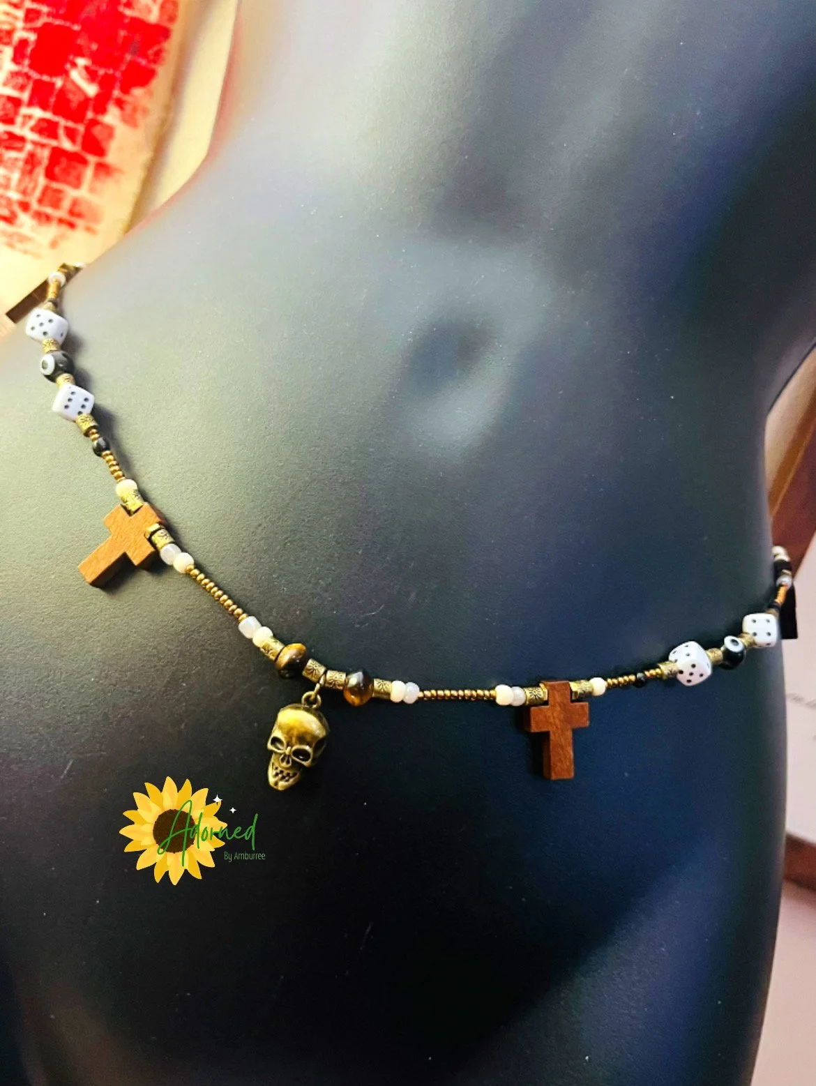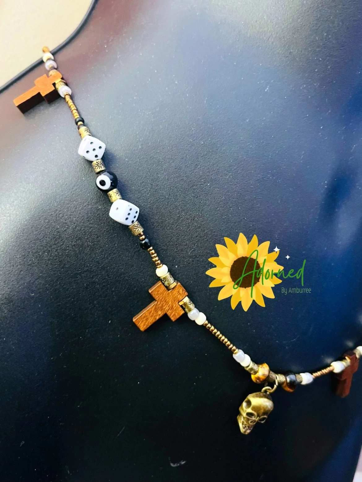 Accents: Brass skull charm, wooden crosses, dice beads, black evil eye beads, metallic spacers